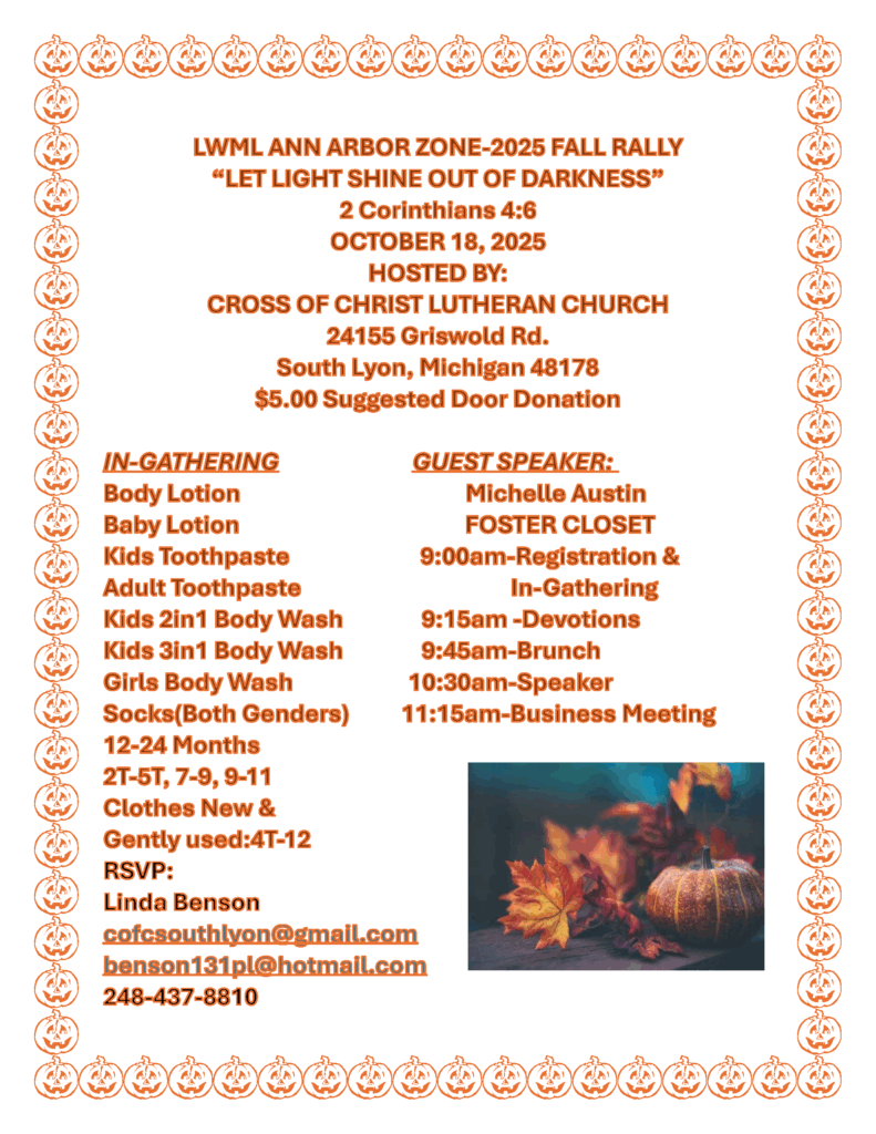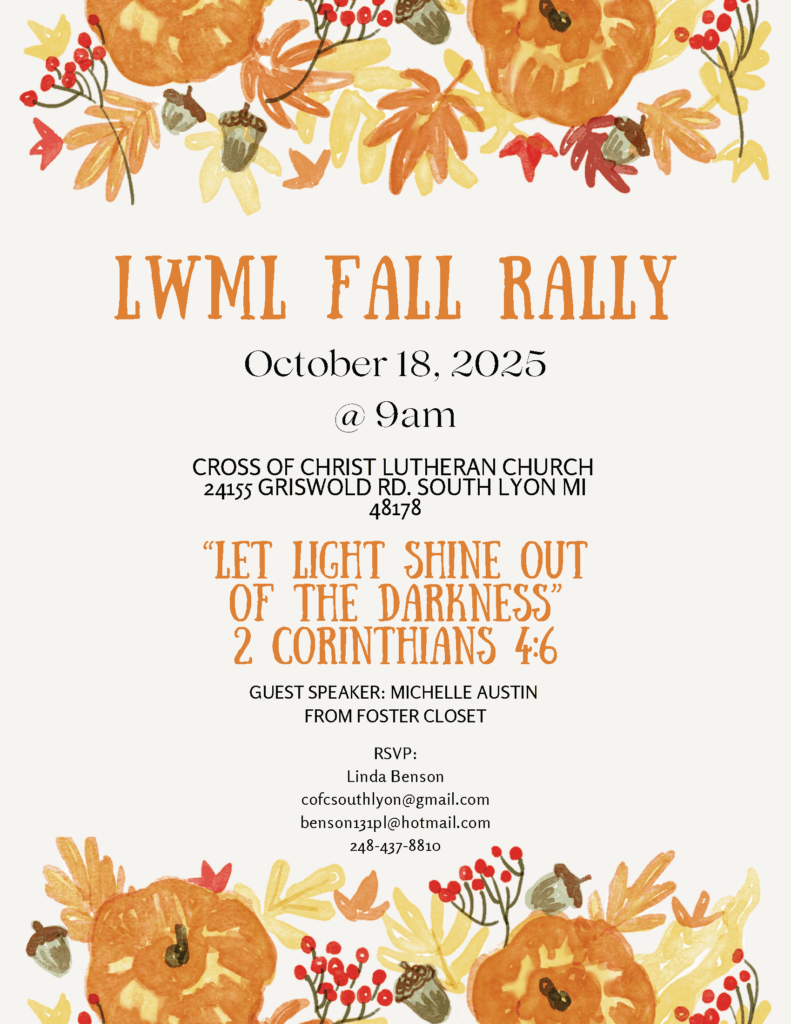 Lutheran Women In Mission (LWML) will meet on Saturday, October 18 at Cross of Christ, South Lyon from 9 a.m. until Noon. The guest speaker is Michelle Austin with The Foster Closet of Oakland County and ingathering donations will go to The Foster Closet per the list provided. There will be a $5 suggested door donation. Cross of Christ is located at 24155 Griswold Rd., South Lyon. RSVP requested to Linda Benson or call 248.437.8810.