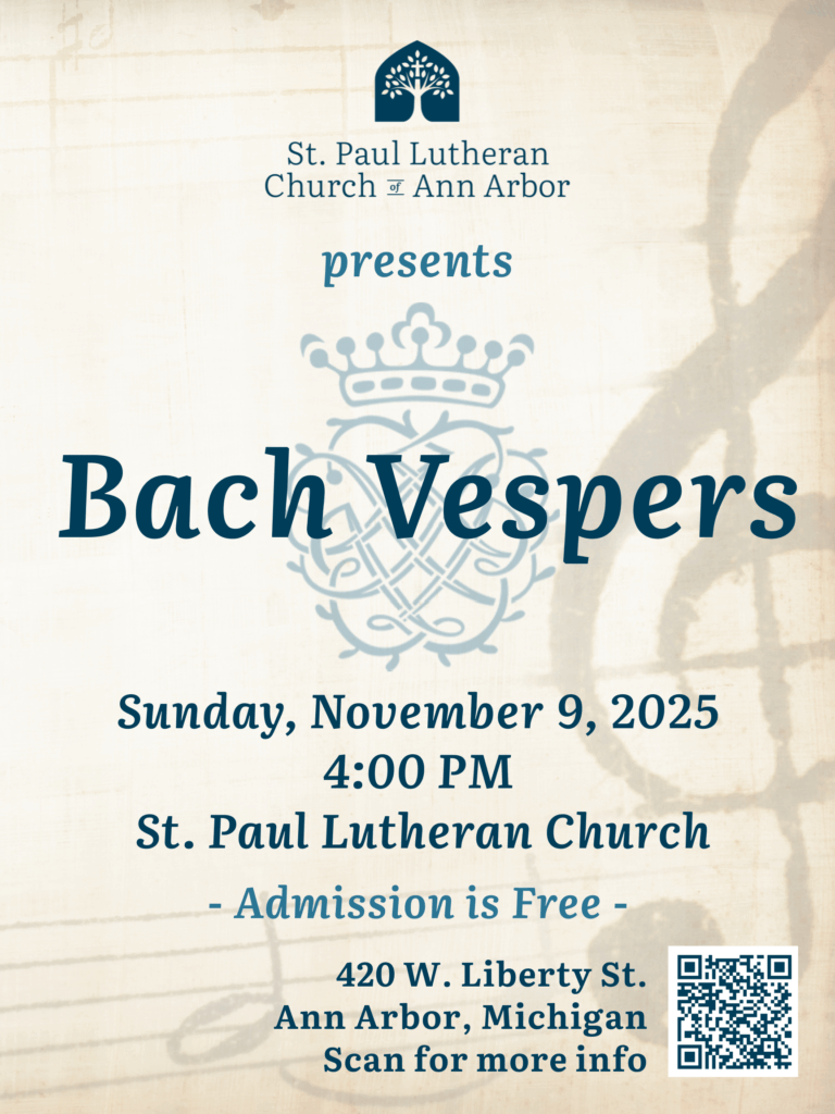 St. Paul Lutheran Church of Ann Arbor is launching a new Bach Vespers series, presenting the beloved cantatas, passions, and oratorios of Johann Sebastian Bach in their original context—the beautiful Vespers liturgy. Professional soloists and orchestra join Ann Arbor community singers, the St. Paul Bach Choir, St. Paul Brass Ensemble, and The Boychoir of Ann Arbor in what is sure to become a wonderful tradition. The cantata for the November 9th performance is BWV 79, Gott der Herr ist Sonn und Schild.