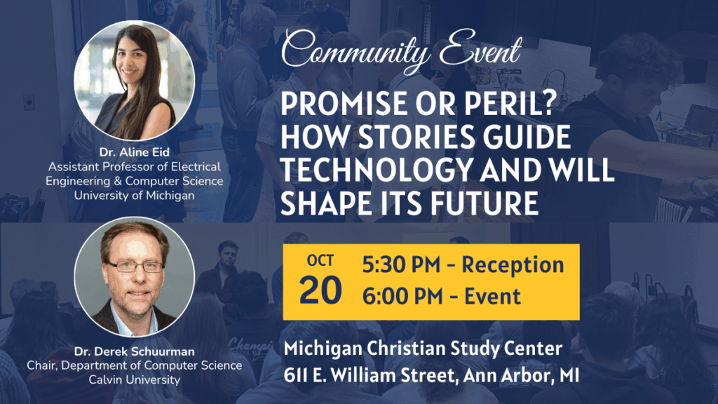 On Monday evening, October 20, the Michigan Christian Study Center will host an event, Promise or Peril? How Stories Guide Technology and Will Shape Its Future. Are digital technology and AI leading us toward a better world, or are they profound threats to humanity’s future? Our answers to these questions stem from deeper assumptions and narratives about the nature of the world. This interactive event will explore the various stories that shape humanity’s view of technology, and suggest ways that the Christian story might guide us towards more responsible technology. If you plan to attend, please RSVP.